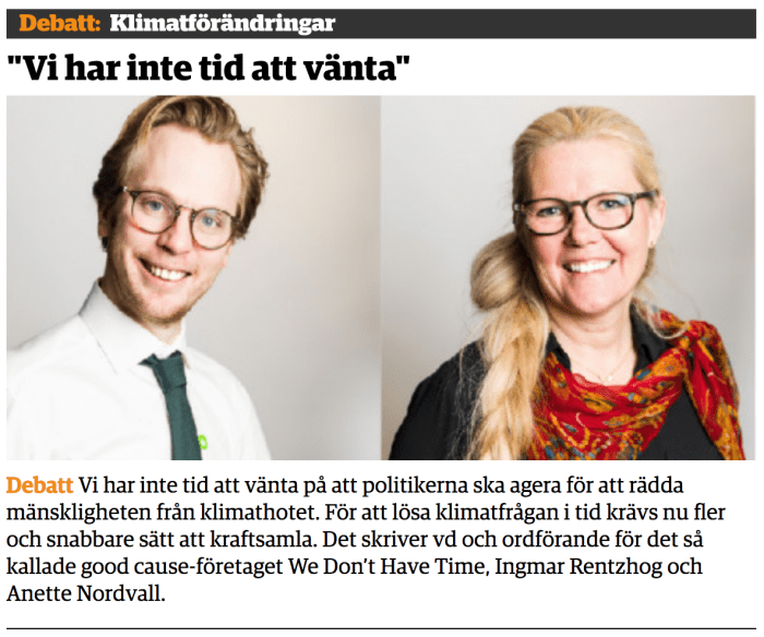 Sticker ut hakan idag och Debatterar med Ingmar Rentzhog, VD på We Don’t Have Time där jag är både tidig teknik investerare och Styrelseordförande. Läs och börja analysera din egen livsstil och vad vi tillsammans kan vara utan i vardagen. Det betyder inte att du ska sluta med allt och känna att du förlorar allt kul, kott och härligt.